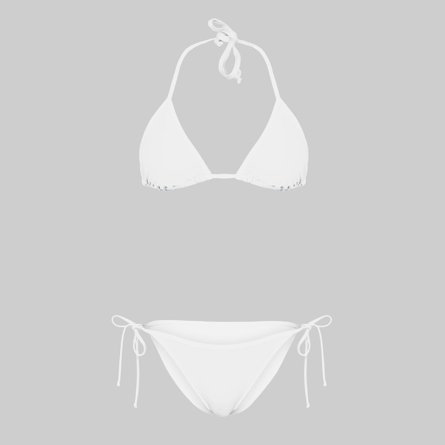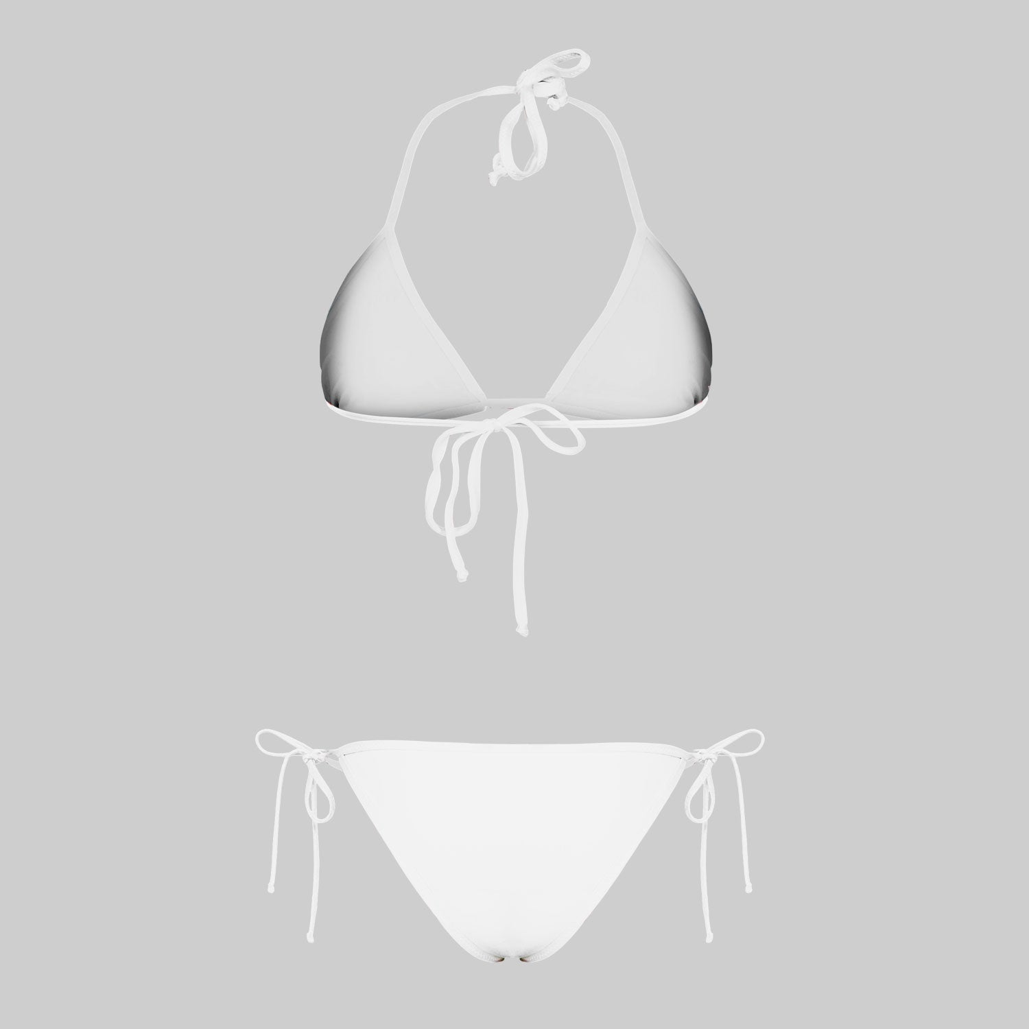Bikini a triangolo in sublimazione. Intermamente foderato all’interno. Sgambatura media. Regolazione con laccetti.