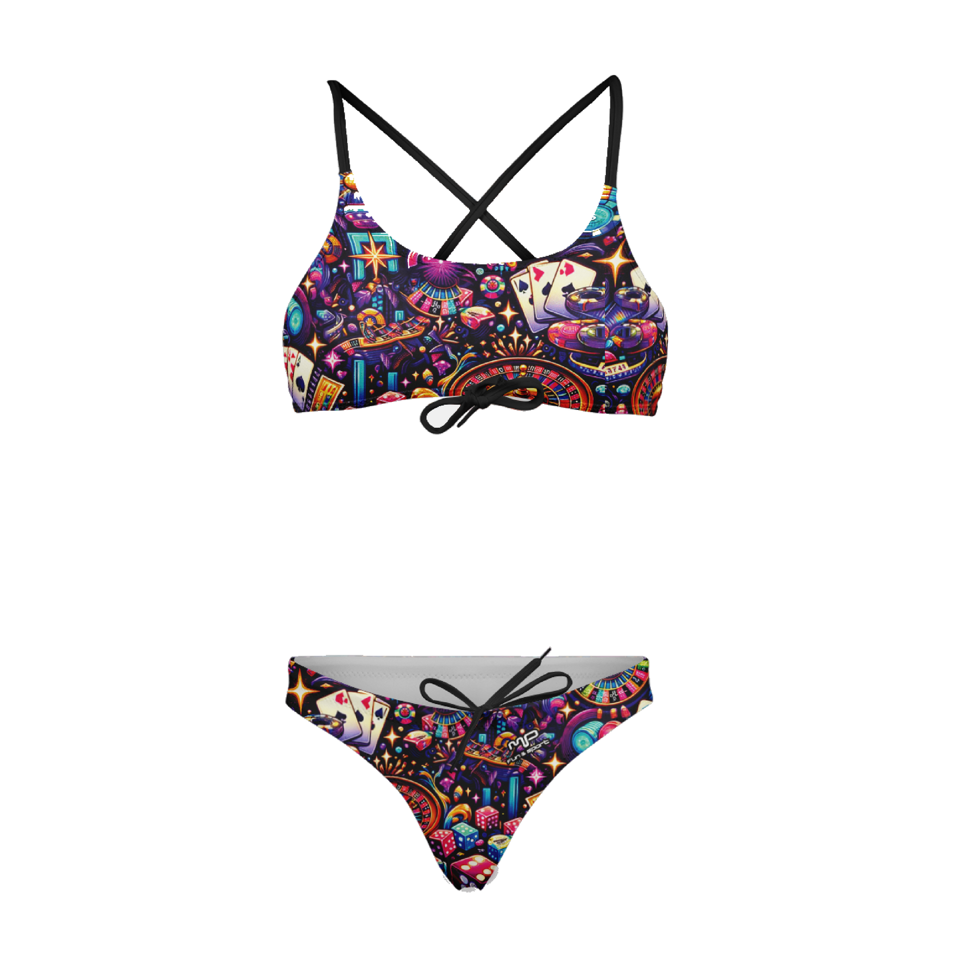 Bikini nuoto in sublimazione a sgambatura media con laccio per regolazione e cuciture zig zag. Top con morbide bretelle tubolari in microfibra.