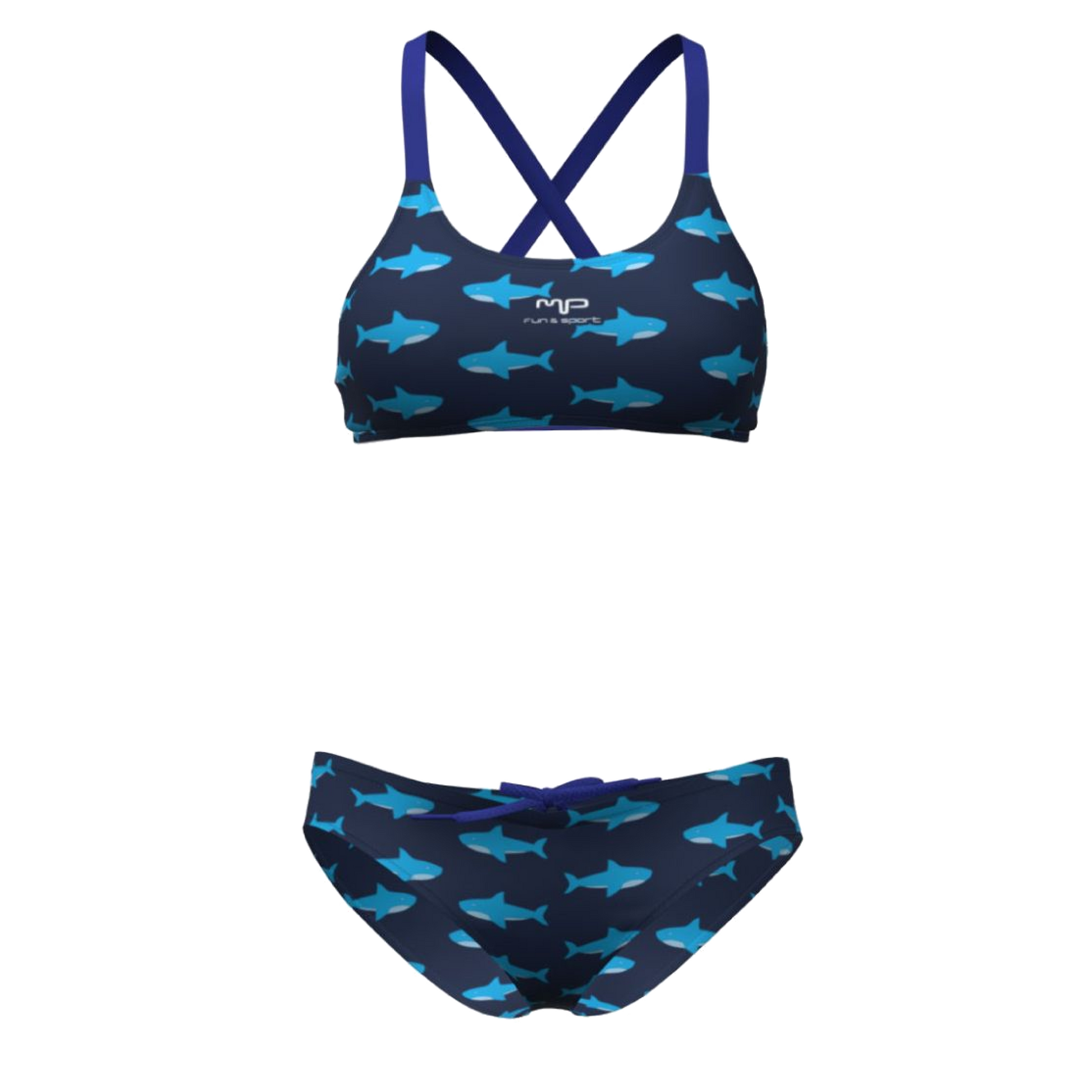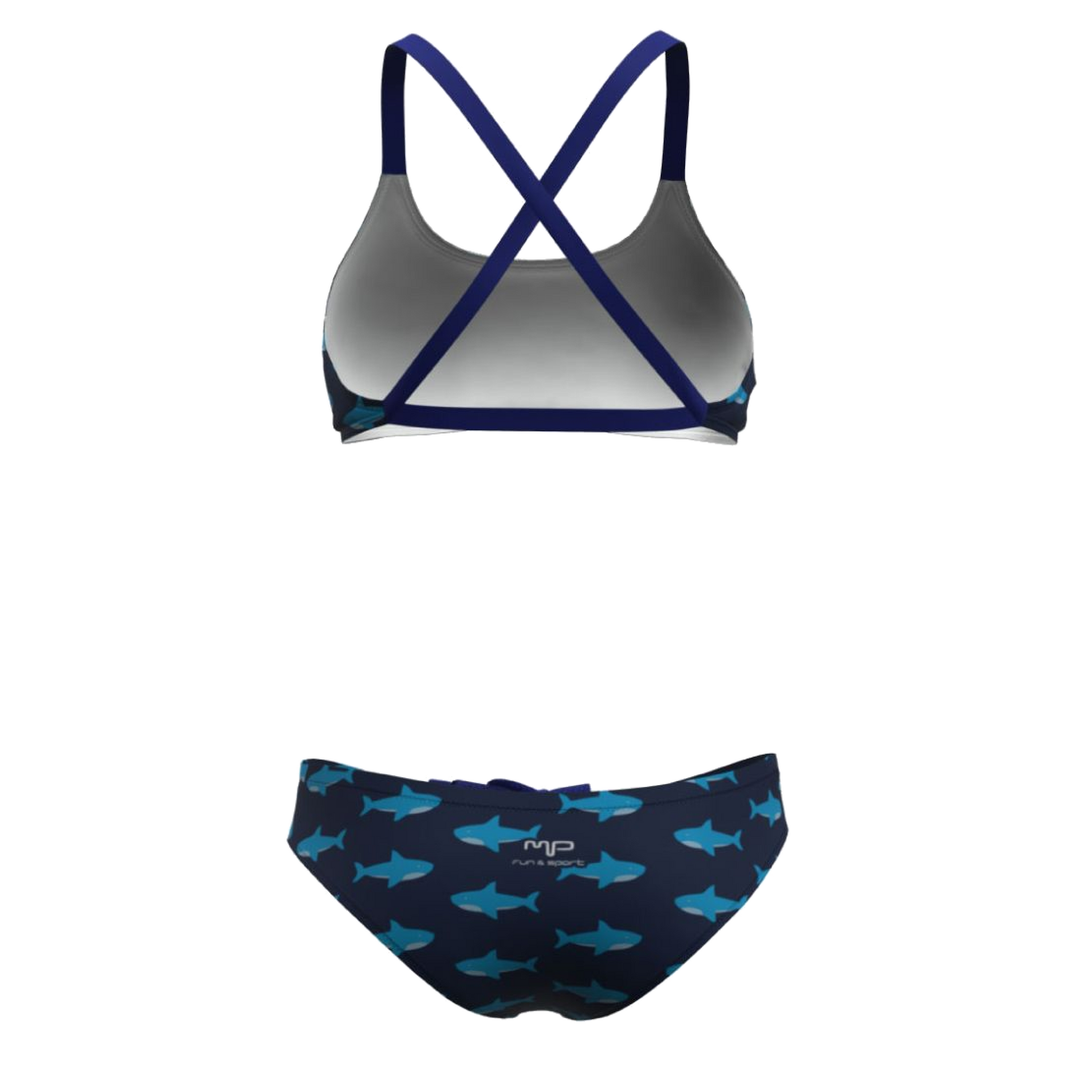 Bikini nuoto in sublimazione a sgambatura media con laccio per regolazione e cuciture zig zag. Top con morbide bretelle tubolari in microfibra.