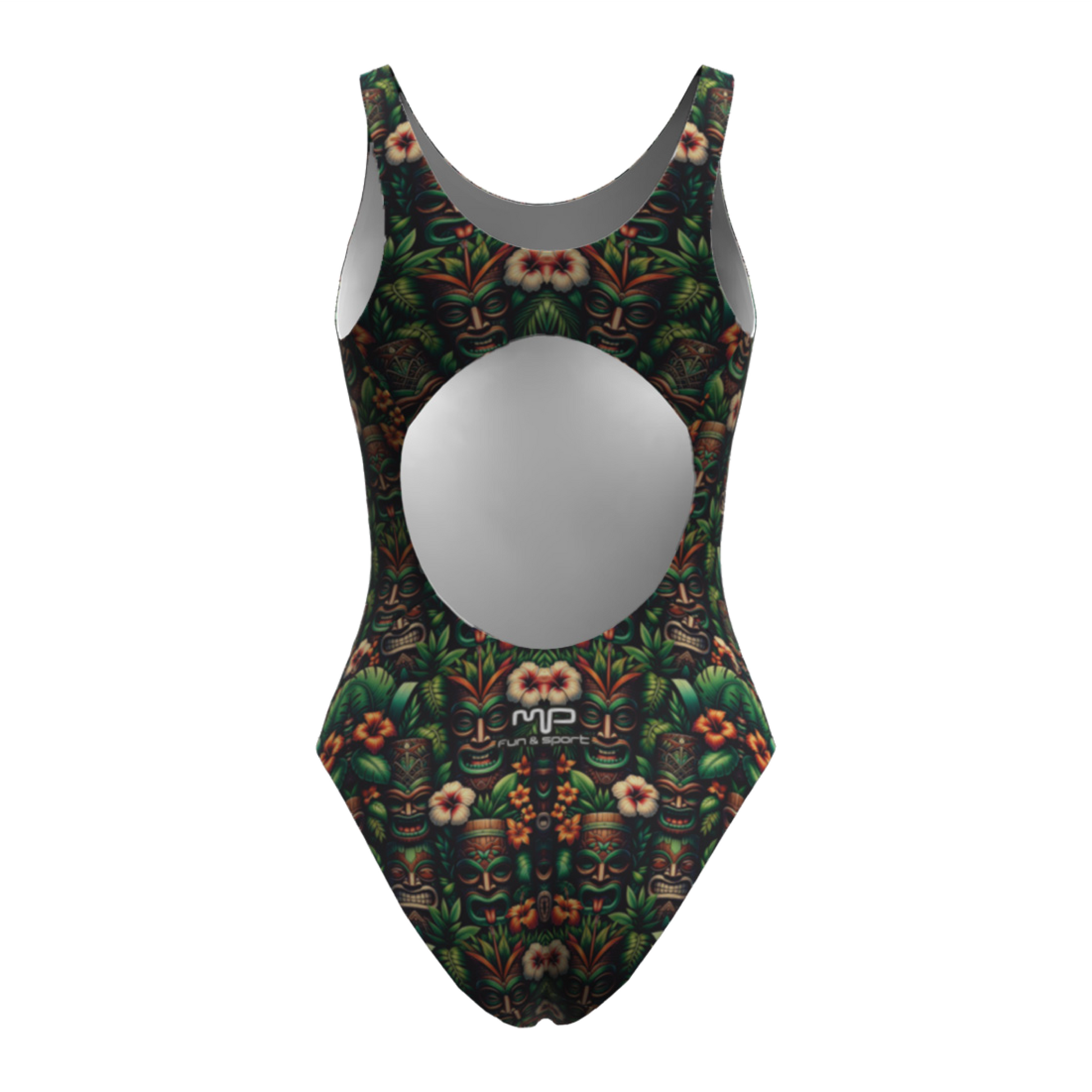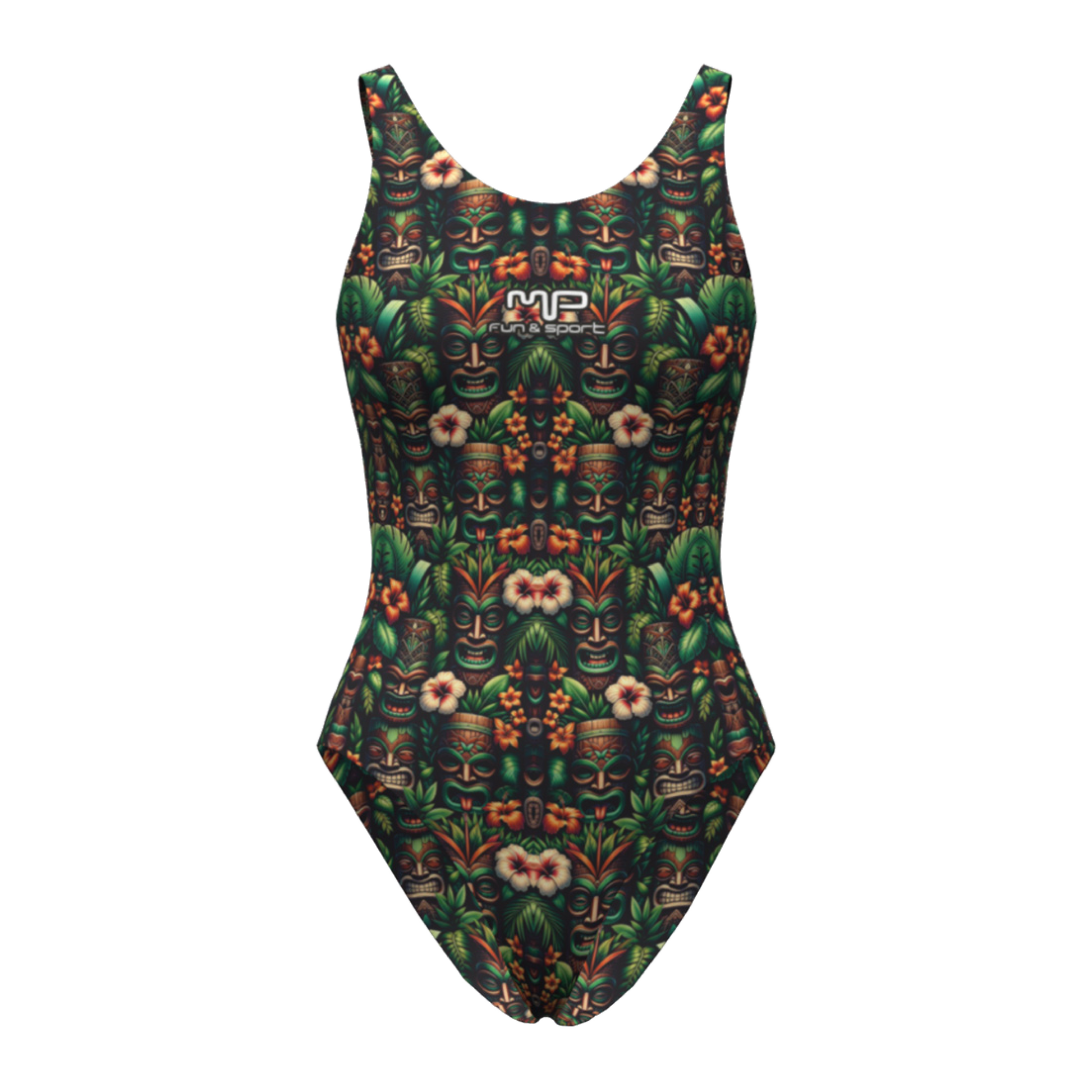 Costume intero donna in sublimazione con sgambatura media e cuciture rinforzate. Foderato fronte retro.