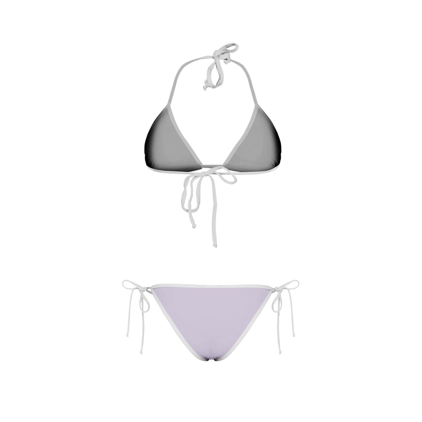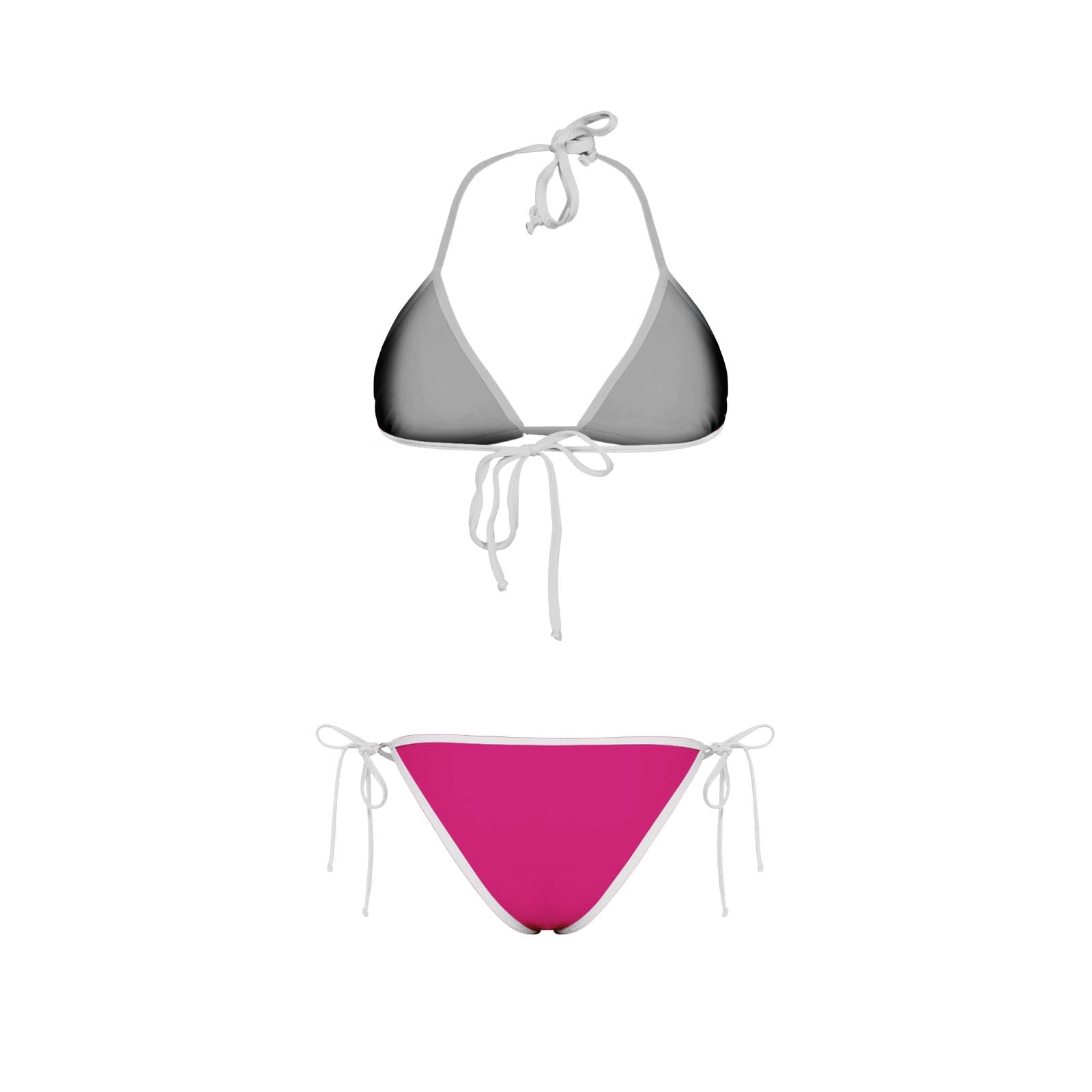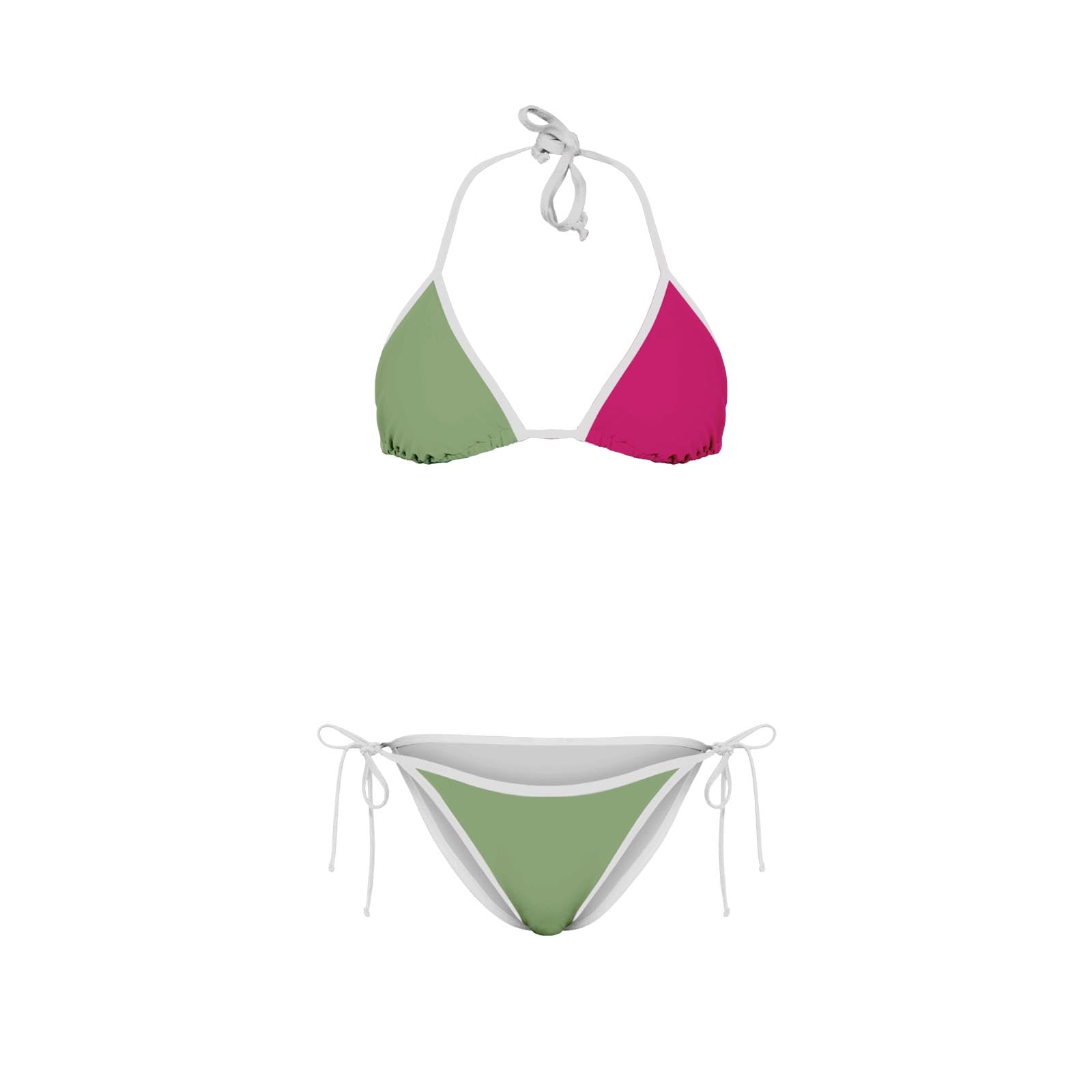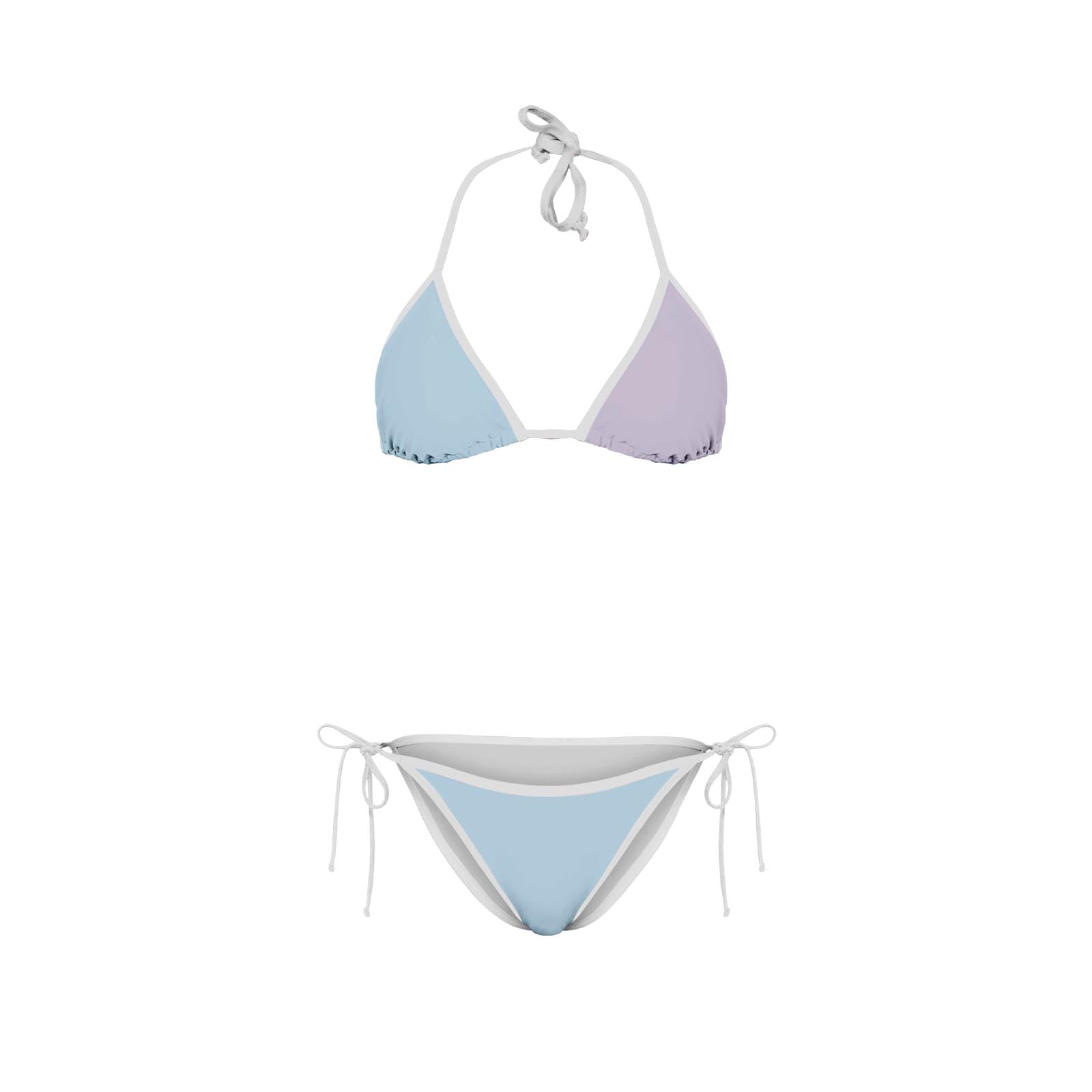 Bikini a triangolo in sublimazione. Intermamente foderato all’interno. Sgambatura media. Regolazione con laccetti.